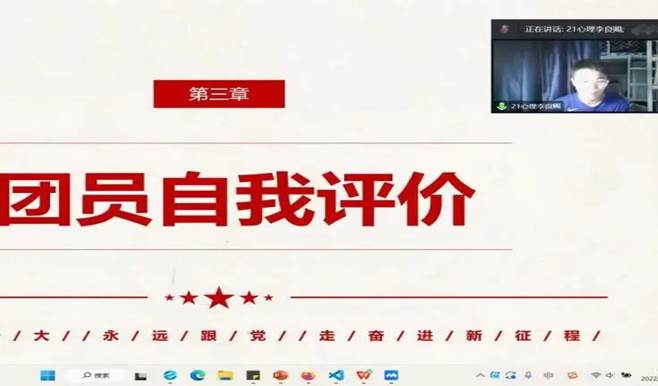 首先,团支书曹雨彤带领团员们奏唱团歌,每位同学都打开了摄像头,团歌节奏铿锵、歌声激昂,同学们立刻肃然起敬。